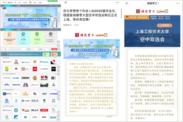 疫情为就业工作带来了巨大的挑战,工程大及时调整招聘形式,积极打造“互联网+就业”的新模式。自春节起,学校联合第三方机构,迅速搭建程园企业“云招聘”平台,在用好教育部、上海市教委就业资源的同时,主动对接1600余家合作单位,全力收集、及时发布各类招聘信息,努力实现求职需求和就业岗位的精准匹配。截至4月7日,学校已通过各类渠道等累计发布325家单位的用人需求,提供就业岗位3500余个,岗位需求总人数超1万。