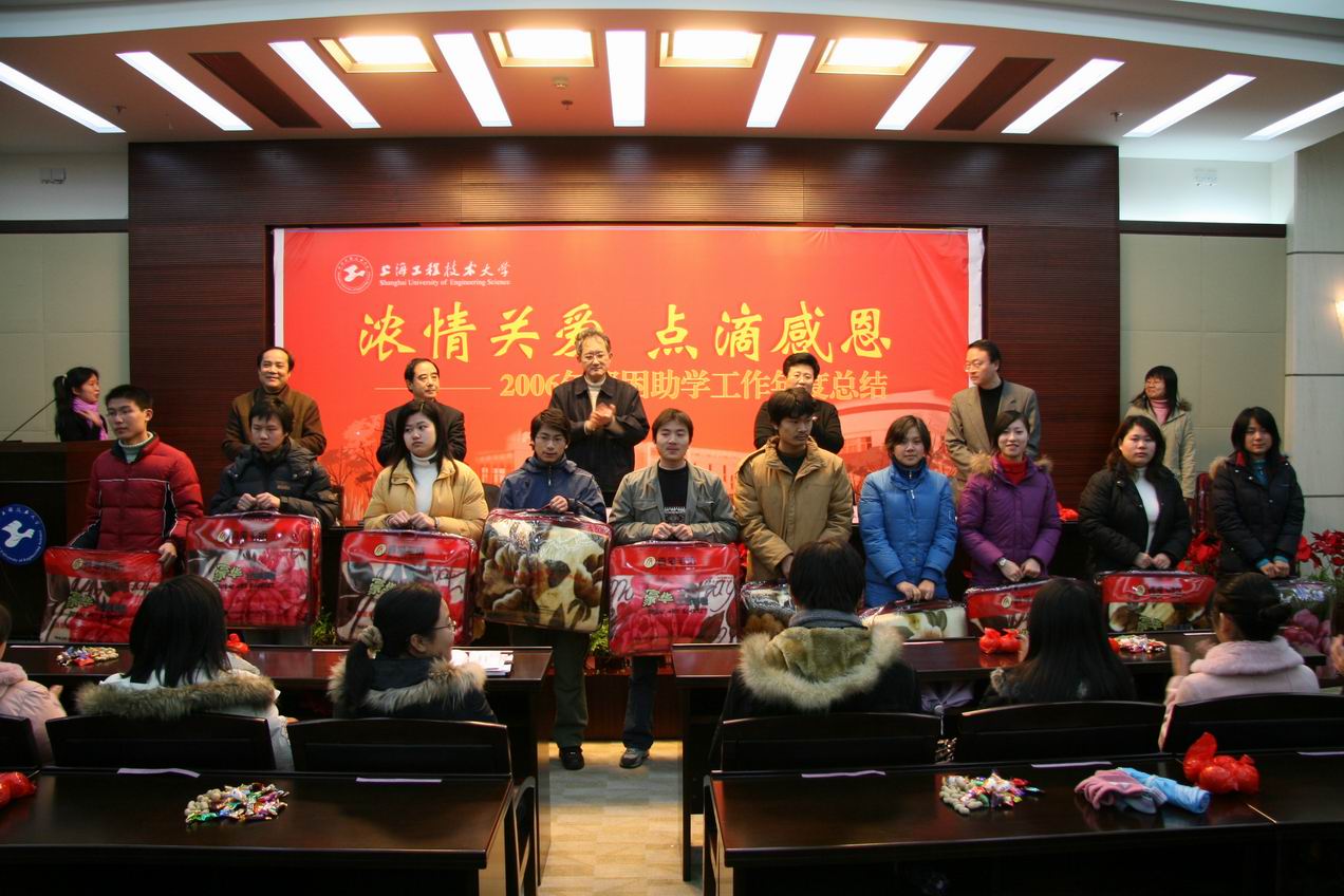 2007年1月15日上午9:00,我校在松江校区图文信息中心第三报告厅召开2006年帮困助学工作年度总结会议。党委书记曹伟武,校长汪泓,副校长郝建平、孙培雷出席了会议,学生处处长王明复、各学院总支副书记参加会议,会议由副校长孙培雷主持。 学生处处长王明复回顾和总结了我校2006年帮困助学工作。去年我校共有2870人次受到过资助,各类用于帮困助学的经费累计达到330万元,其中来自于学校的各类奖助金共计206万元,占62.5%,来自于国家补助的共计84万元,占25.4%,来自于社会资助的共计40万元,占12.1%。 会上,校领导宣读了获得2006年上海慈善基金会提供的晨兴教育基金、中华慈善教育基金、龙元建设助学金的学生名单及各学院帮困补助经费,将沉甸甸的资助金、厚实的毛毯送到受助学生的手中,并将语重心长的教诲、新春佳节的祝愿传达到受助学生的心底。 受助学生代表在会上向社会、学校表达了他们的诚挚谢意。同学们用自己的切身经历,用自己的所得所感,向学校领导表达了一份感激之情,向全校学生发出爱的倡议:出身无法选择,但我们的命运可由自己把握,在人生这条道路上,有社会,有政府,有学校,有那么多的好心人在给予无私的帮助,我们只有用更加勤恳的学习才能来表达发自内心的感谢。我们要以感恩的心帮助身边那些需要帮助的人,使帮困助学的活动精神得以延伸,结出丰硕的果实。 会上,校长汪泓发表了热情洋溢的讲话,她指出:高校的帮困助学工作是育人成才工程中的重要部分,党和政府、企业家等社会各界高度重视,给予了许多关心和支持。学校党政领导高度关注帮困助学工作,从经费和制度上加以保障,以极大的热情推进帮困助学工作,通过多渠道凝聚社会各界的力量,使各个层面的帮困措施发挥最大的功效。汪校长还以自己的成长经历深情地勉励同学们要自信面对人生的挫折,化暂时的困难为人生的精神财富,自强不息,发奋学习,培养自己的使命感,做遵守校纪校规的表率。汪校长对学校各部门给予帮困助学工作的支持和全体学生工作干部辛勤工作所取得的成效给与了充分的肯定,并对学校的帮困助学工作提出了要求,希望不仅要从经济上加以扶助,使家庭困难学生可以安心学习,还要充分发挥学校各个层面帮困助学工作的作用,磨练受助学生的意志,培养感恩意识,立志成才,回报国家、学校及社会各界的浓情关爱。
