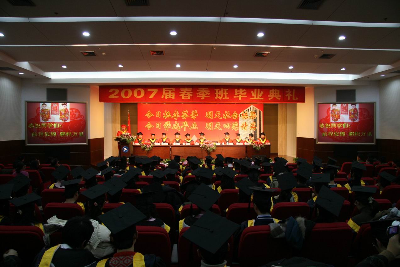 |  1月18日,我校2007届春季班毕业典礼在松江校区图文信息中心第二报告厅隆重举行。校党委书记曹伟武,校长汪泓,校党委副书记田信灿,副校长郝建平、孙培雷、陈力华、程维明出席了毕业典礼,有关部门、学院党政负责人以及春季班毕业生96人参加了毕业典礼,此次典礼由孙培雷副校长主持。 毕业典礼上,校领导对获得上海市优秀毕业生称号的同学进行了表彰,并颁发了证书和奖品。 毕业生代表和毕业生家长代表分别作了发言。毕业生代表表达了对母校、领导和老师的真挚感谢和深深的眷恋,并代表全体同学向母校郑重表示:今天我以工程大为荣,明天工程大以我为荣。毕业生家长代表对学校、老师的教育、培养表示衷心感谢,希望毕业生们不辜负学校和家长的期望,在社会大舞台上展现青春年华,开始人生更壮丽的旅程。 汪泓校长对毕业生们作了热情洋溢的讲话,对老师们四年来的辛勤努力表示感谢,对毕业生们四年来在学业上所取得的成绩表示肯定,并希望毕业生们不断勉励自己,开创属于自己的新天地,肩负起报效祖国、振兴中华的神圣职责;勤奋学习、勇于创新,树立终身学习的理念;爱岗敬业、乐于奉献,在平凡的岗位上建功立业;解放思想,与时俱进,珍惜作为工程大学子的荣誉。 隆重、热烈的毕业典礼在《毕业歌》激昂的旋律中圆满结束。