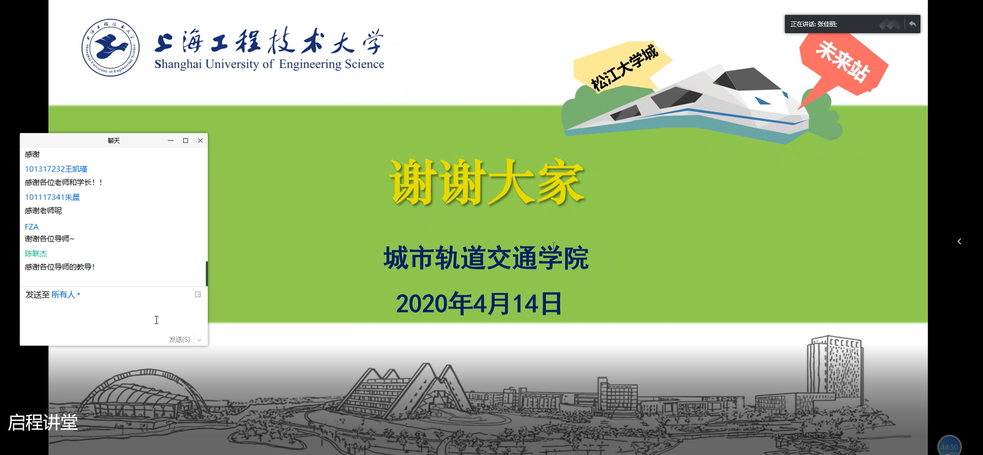 为深入贯彻落实党的十九大精神,把全国教育大会、全国及上海高校思想政治工作会议精神落到实处,践行“三圈三全十育人”教育理念, 积极探索“开门办思政” 举措创新,4月14日,城市轨道交通学院联合上海地铁第三运营有限公司举办本年度第一场企程讲堂——“轨交中国”校企思政讲堂之“开往春天的青春轨道”。活动采用“云”直播的方式,邀请企业导师、技术能手、优秀校友走进思政“云”课堂,共同培育理想信念坚定、专业技术扎实、爱国情怀深厚、德才兼备的高水平轨道交通应用型人才。上海地铁第三运营有限公司团委书记钱晓懿,城市轨道交通学院学生工作办公室负责人袁梦丹、学院团委书记梅文静、各年级辅导员、学院学生代表100人参加了本次活动。活动由辅导员张佳丽老师主持。