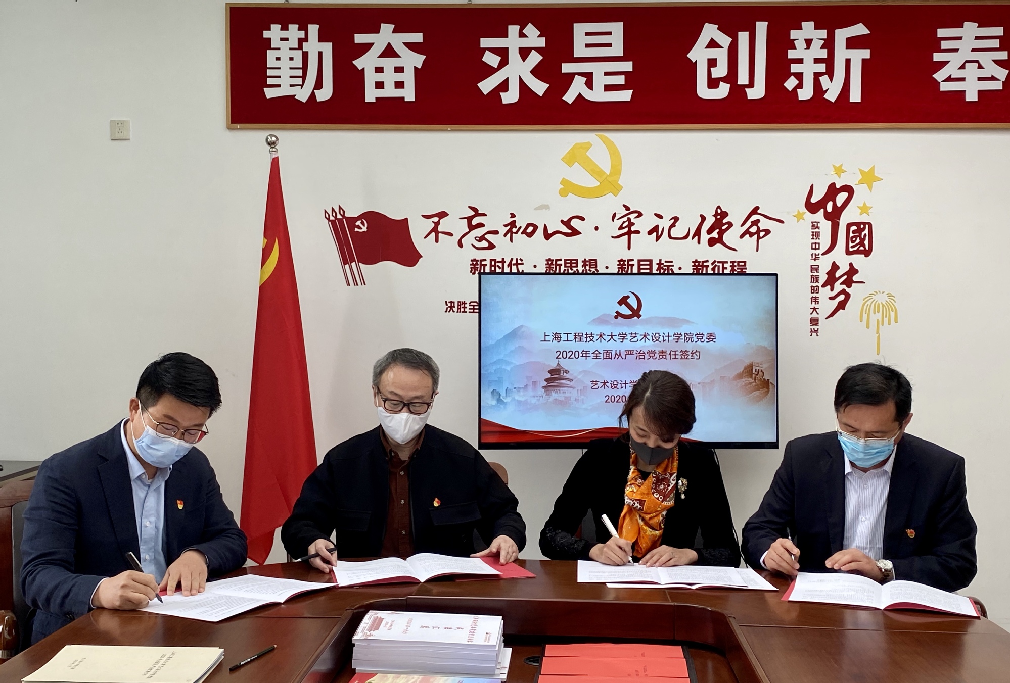 最后,院党委书记袁蓉与党委副书记、艺术设计学院院长高瞩、中韩多媒体设计学院院长吴亚生分别与学院的副院长签署了《艺术设计学院党委2020年全面从严治党责任书》。