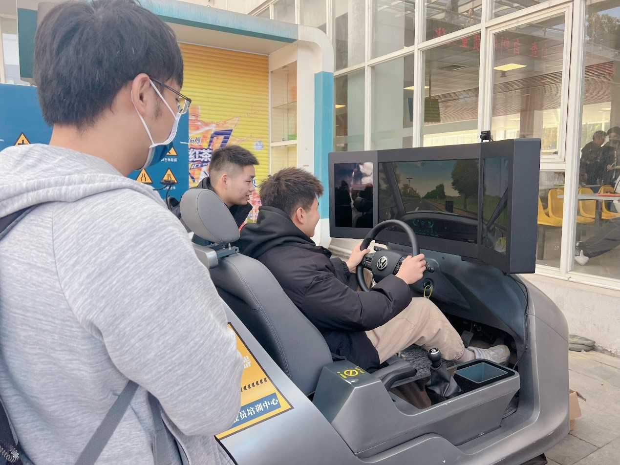 现场,同学们体验了4D座椅和VR驾驶模拟器,可还原车祸现场真实体验,通过丰富的真实案例沉浸式重现,将“知危险、畏生命”的种子种在学习驾照之初,将安全文明驾驶的观念深刻烙印在之后的驾驶行为中,从而助力降低交通事故的发生。