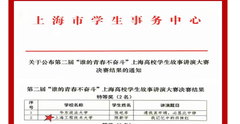 此外,为深入挖掘困难学生背后的感人励志故事。学院党委副书记黄中子、资助辅导员李适老师指导学院22级车辆工程专业陈新宇同学参加第二届“谁的青春不奋斗”上海高校学生故事讲演大赛。陈新宇以《我记忆中的四抹红》为题讲述自己在国家资助政策的支持下自强不息的青春奋斗故事,陈新宇同学以总分第一名的成绩荣获上海市特等奖。陈新宇同学的优秀成长事迹作为学院典型资助育人案例,良好诠释了学院在资助育人工作中着力践行“解困---育人---成才---回馈”的发展型工作宗旨。