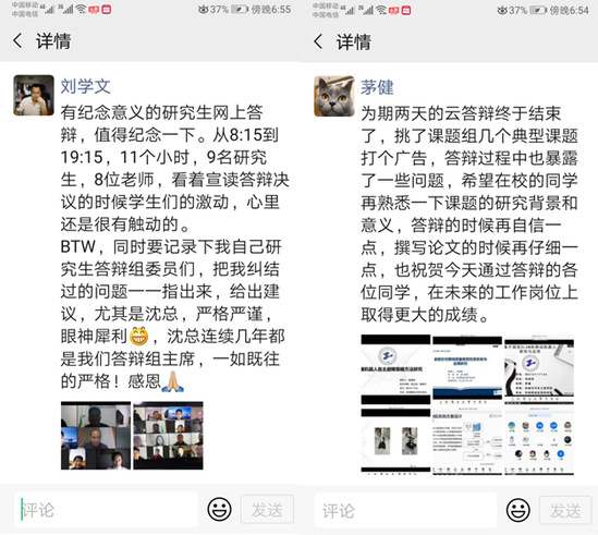 “受这次疫情的影响,身在全国各地的老师和同学们通过网络‘齐聚一堂’,举行了一次别开生面的云答辩。在答辩的准备阶段我又紧张又期待,但是评审老师们一直耐心引导,对我的科研工作给予肯定的同时,也提出了许多宝贵的意见。第一次经历这种新颖独特的答辩形式,非常有纪念意义!”身处湖北武汉的杨敏同学感慨道。机械设计及理论专业的宛宇同学在准备期间同样得到了老师们的悉心指导和关怀,“我深知顺利完成答辩的背后,是老师们不辞辛苦对答辩流程的统筹协调,是答辩委员会老师们的认真负责。这次线上答辩,答辩形式和内容也更加严谨,让我受益匪浅。”