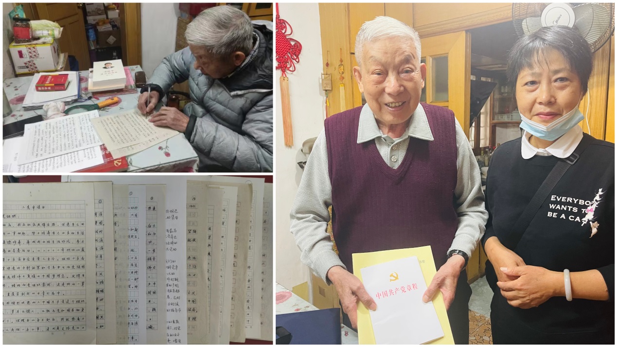 许晴华积极配合党委和党支部的培养工作,虽然历经白内障手术,仍坚持学习党的知识、认真阅读文章,按时向组织汇报思想,坚持亲自手写并按时递交了14份,逾1.3万字的思想汇报。退休教工第十八党支部书记史泰冈和联系人史维珍、施耀光等老师相继登门和许晴华老师谈心,了解思想情况并将学习资料“送学上门”,面对退休党支部老师们年龄和身体等方面的困难,退休教工党委全程指导、协助发展流程,登门指导材料填写。许晴华老人由于年老体弱、腿脚不便,无法参加学校党校的学习培训,校党委组织部将学习内容录制成视频寄送上门并开通网上学习培训通道,助其顺利完成党校培训。