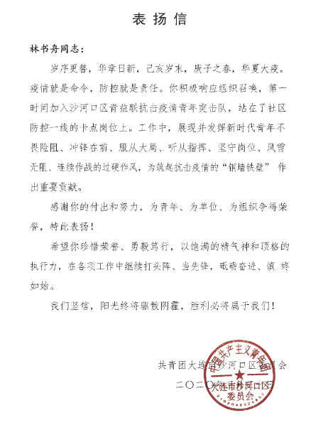 近日,城市轨道交通学院团委收到了一封来自大连市沙河口区团委的表扬信,表扬该院学生林书舟同学在疫情期间的突出表现。