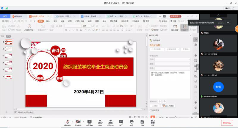 为进一步推进学院的学生就业工作,4月22日晚,纺织服装学院线上召开毕业生就业动员会,纺织服装学院党委副书记张漪、谢志霞,就业辅导员、毕业班辅导员和全体毕业班学生出席此次就业动员会。会议由就业辅导员杨慧舜主持。