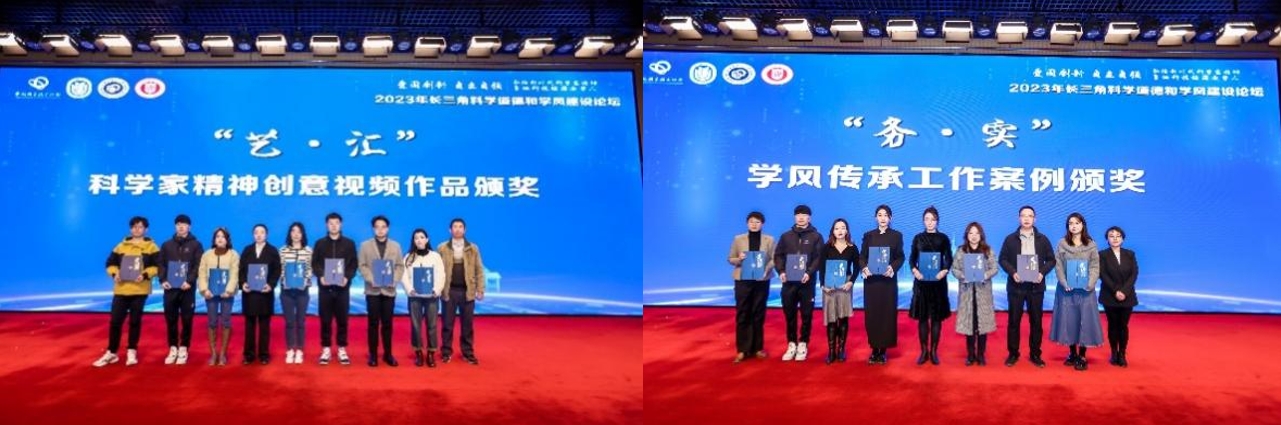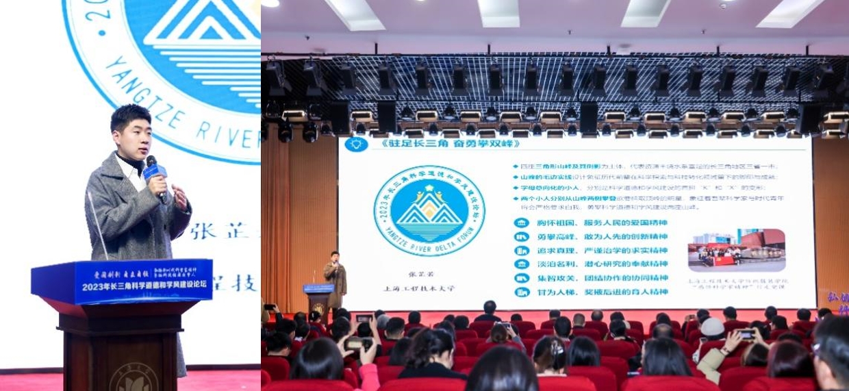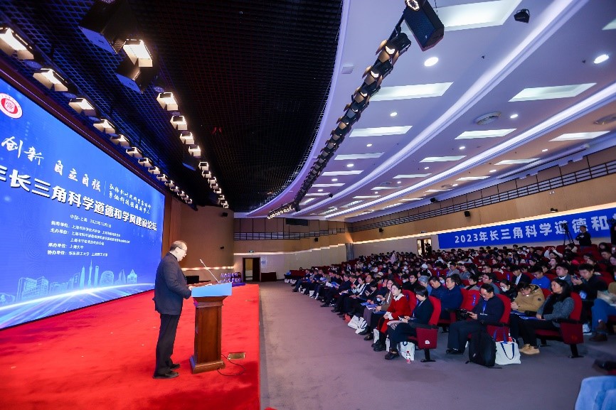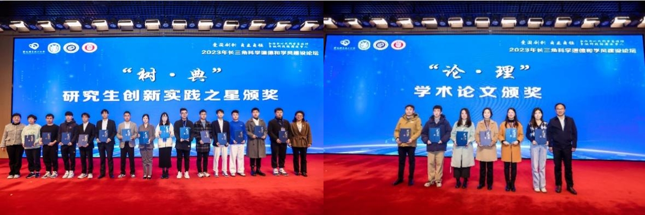 12月1日,2023年长三角科学道德和学风建设论坛在上海大学举行,我校党委研究生工作部副部长王东阳带领获奖师生代表出席本次论坛并参与颁奖仪式。本次论坛由上海市科学道德和学风建设宣讲教育领导小组办公室、上海市学位委员会办公室主办,旨在深入学习宣传贯彻党的二十大精神和习近平总书记关于大力弘扬科学家精神以及加强学风建设的重要指示精神,进一步落实全国研究生教育会议精神,培养爱国创新、自立自强的科学家底色,大力弘扬新时代科学家精神,勇做科技强国逐梦人。来自长三角地区高校的相关领导和师生代表参加了会议,会议由上海市教委高教处处长杨颉主持。