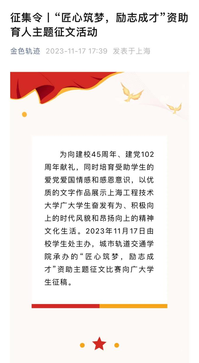 为向建校45周年、建党102周年献礼,同时培育受助学生的爱党爱国情感和感恩意识,以优质的文字作品展示上海工程技术大学广大学生奋发有为、积极向上的时代风貌和昂扬向上的精神文化生活。11月17日由校学生处主办,城市轨道交通学院承办的“匠心筑梦,励志成才”资助主题征文比赛向广大学生征稿。活动于2023年12月4日圆满结束,自开展以来,同学们参与积极性高涨,共收到来自各个学院的征文80余篇。活动由城市轨道交通学院党委副书记盛知恒牵头,学院全体辅导员老师全程指导。