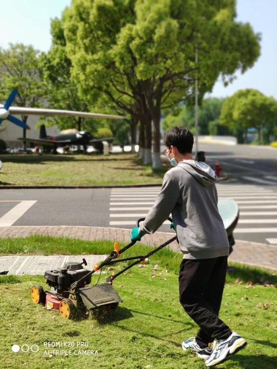 上午8时,已升温明显。管理学院学子姜通敏在保洁阿姨带领下,开始清洁教学楼玻璃。10时,电子电气工程学院苏坤宣则开始跟着绿化工人打理校园绿化,给大草坪理个发。