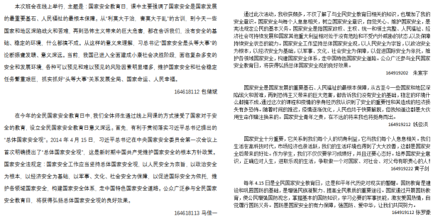 开展国家安全教育活动。为引导大学生牢固树立和认真贯彻总体国家安全观,切实增强广大学生的忧患意识和底线思维,全体辅导员和班主任开展线上班会,以提高学生抵御各类国家安全风险的能力。