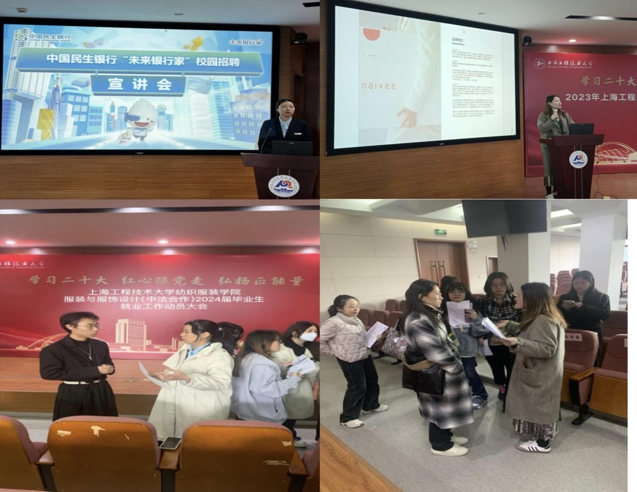 中国民生银行上海分行虹桥支行和上海纳薇服装设计有限公司代表开展了企业宣讲,同学们反响热烈,在现场积极投递简历。