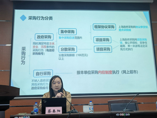 蔡春阳以《政府采购业务培训》为题,从政府采购基本概念、发展历程、政策法规、实务操作、案例解读等五个方面,对政府采购有关法律法规规章和规范性文件进行了深入讲解,结合具体案例,分析了政府采购工作中容易出现的问题和风险,强调采购人要增强主体责任意识,对采购需求和采购实施计划的合法性、合规性、合理性负责,学校要建立长效审查工作机制,加强内部控制和风险管理,强化廉政风险防控。
