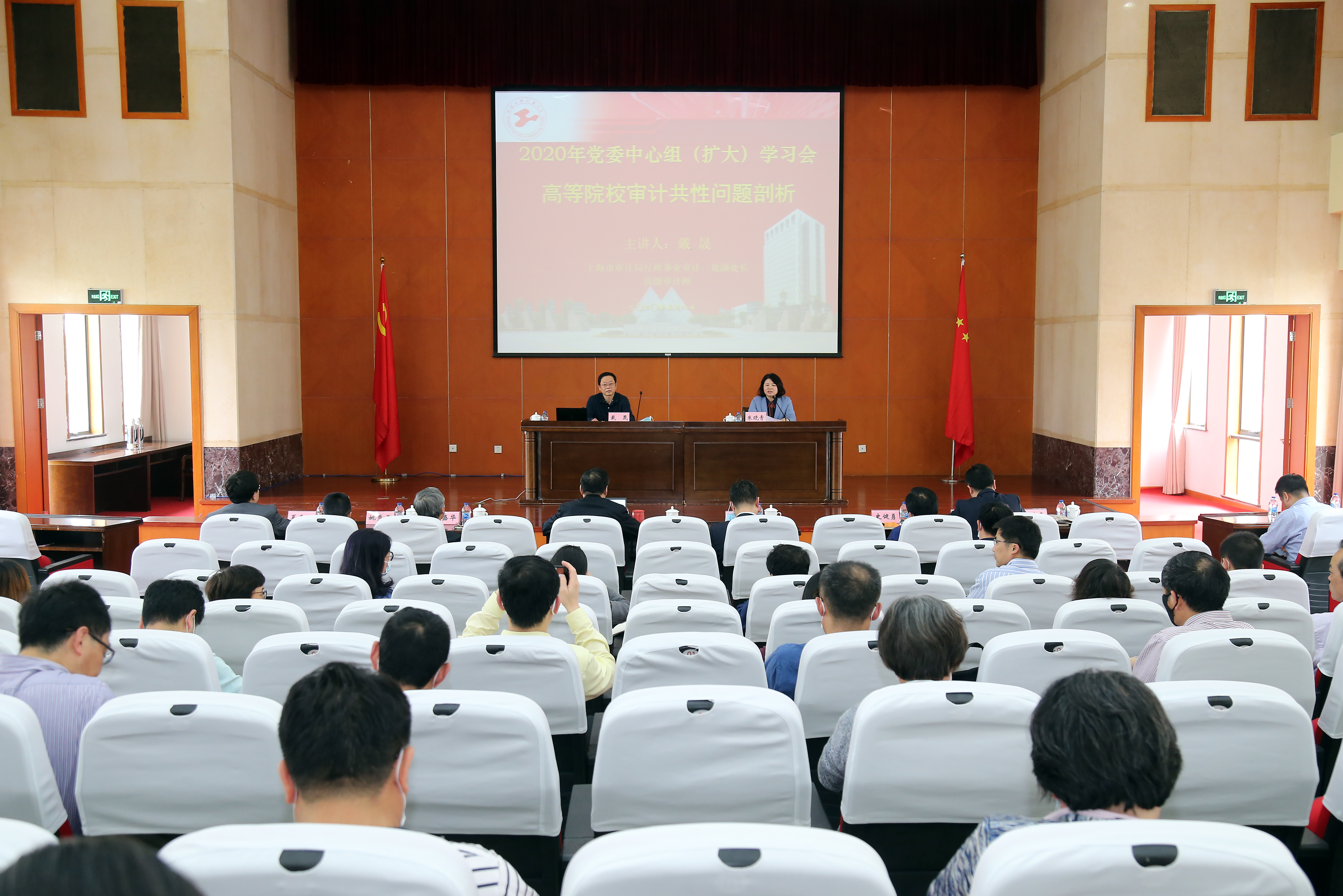 为了全面贯彻党的十九大精神,深入贯彻落实习近平总书记在中央审计委员会第一次会议上的重要讲话精神,适应经济社会发展的新常态,紧紧围绕教育改革及上海市教育事业发展规划的有关要求,提高学校内部审计的基础能力建设,完善学校的内部治理体系结构,服务学校的转型发展,5月8日下午,校党委中心组在行政楼B301会议室及图文信息中心第二报告厅举行了专题学习会,市审计局行政事业审计一处副处长,高级审计师戴晟作了《高等院校审计共性问题剖析》专题辅导报告。校党委中心组成员、全体中层干部、相关部门科级以上干部、各学院党政办公室主任等200余人参加会议,校党委副书记、副校长朱晓青主持会议。