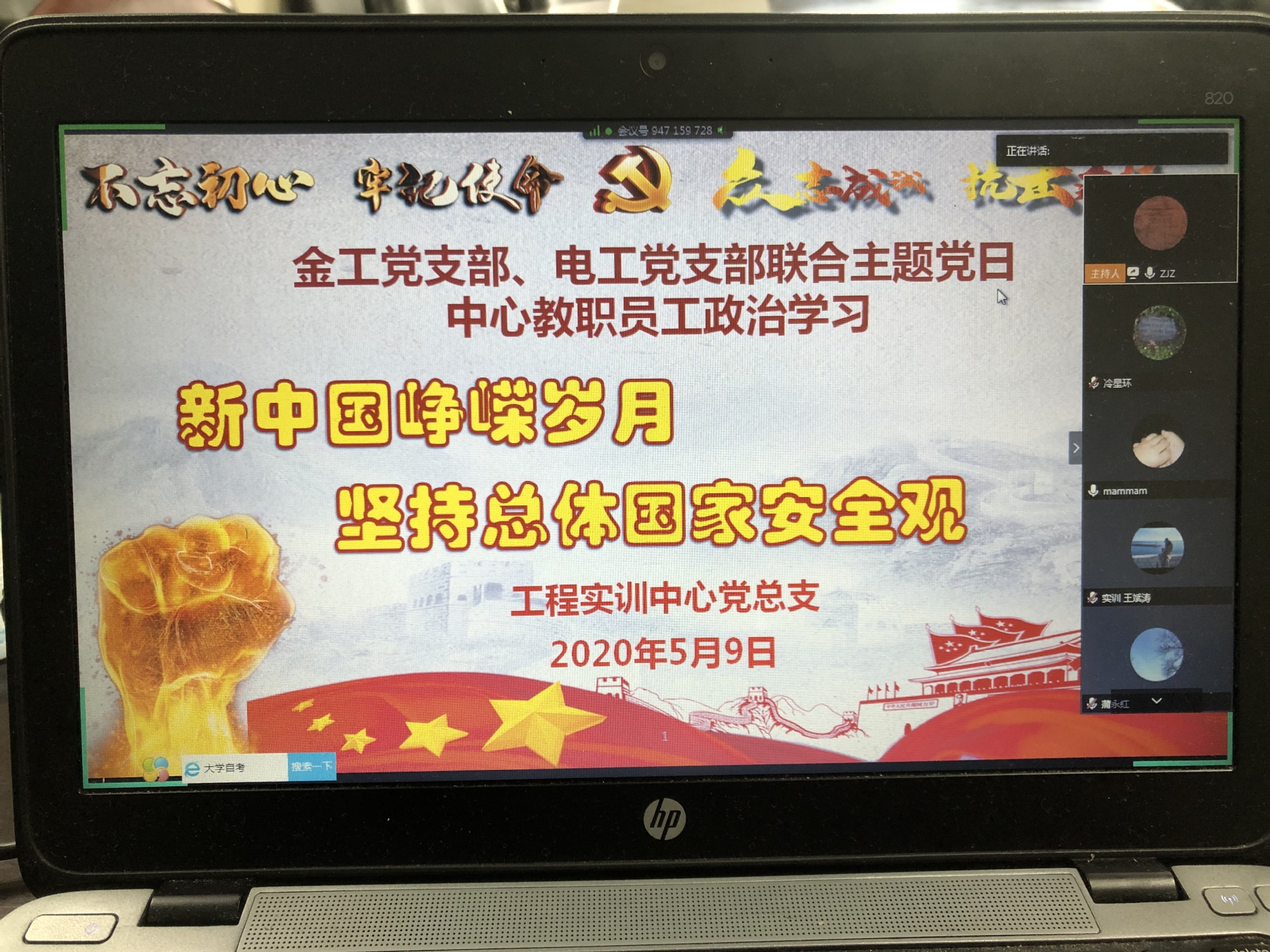 5月9日,工程实训中心金工党支部和电工党支部联合开展全民国家安全教育,主题为“新中国峥嵘岁月——坚持总体国家安全观”,同时在中心内开展同一主题的中心教职员工政治学习,本次学习采用了“网络在线会议学习+微信群讨论”的形式开展。