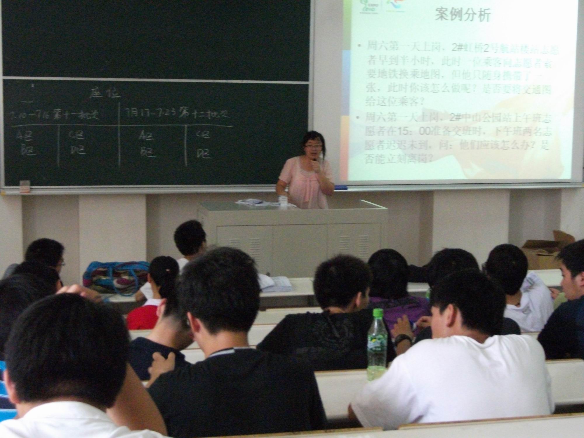 | 7月1日下午13:00,城市文明暑假地铁志愿者岗前培训在教学楼C219举行,管理学院125名地铁志愿者参加了此次培训。  本次培训主要针对地铁志愿者暑期工作的部署,以及上岗之前的准备工作。培训强调了志愿者的礼仪,要求大家做到服装统一,证件齐全,形象得体。同时,培训也强调了安全措施,要求大家注意防蚊防暑,注意饮食安全,妥善保管好私人的贵重物品。 岗前准备是本次培训的重点,作为一名世博地铁志愿者,地铁换乘知识、基本英语口语听说能力、上海旅游景点、大型商场、展馆分布,志愿服务站点周边门票销售点与世博特许商店分布等情况,都应该提前储备。对于地铁换乘知识,志愿者可以查看地图手册或上网查询,而英语口语听说能力则需要志愿者平时多训练,在遇到说小语种的游客时,志愿者可以上网搜寻或直接拨打962288专线寻求语言翻译帮助。对志愿者的认定和工作能力的评估,也有一系列的激励措施。例如,每月之星评比,优秀站点评比,优秀志愿者评选以及资深志愿者的评选,都是对志愿者的鼓励和肯定。岗前培训为提高志愿者的工作能力,以便更好的为游客服务打下了良好的基础。 |