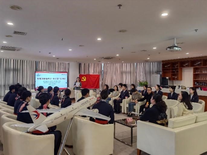 12月18日下午,一场主题为“学思践悟凝共识,细照笃行促发展”的主题党日活动在航飞楼教工小家举行。2015届空中乘务专业毕业生代建鹏带领东航客舱部乘务四部第三党支部党员同志们,回到程园,与航空运输学院(飞行学院)教工第一党支部开展支部共建活动。航空服务艺术与管理专业的学生入党积极分子参加活动。教工第一党支部书记赵鸣老师主持会议。