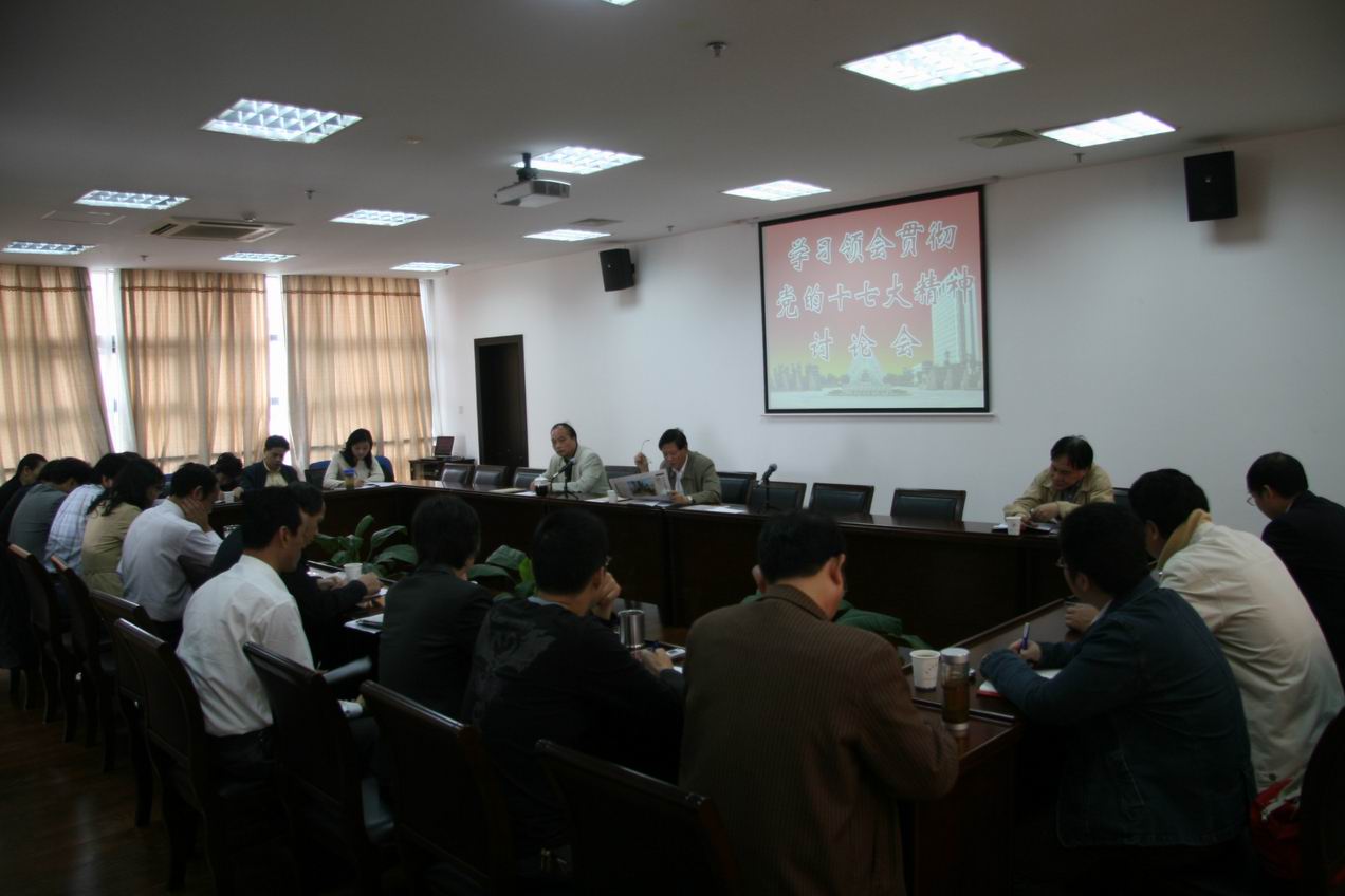 |  党的十七大隆重召开和胜利闭幕的喜讯洋溢着工程大的校园,连日来,广大党员干部以极大的政治热情通过广播、电视、报纸、网络等各种媒体,热切关注十七大,开展自学、座谈、专题讨论等形式活动,学习、领会、理解十七大精神,兴起学习、宣传、贯彻十七大精神的热潮。10月25日上午9:30党委在行政楼B402组织召开了“学习宣传贯彻十七大精神讨论会”,会议由党委副书记田信灿主持,部分学院党总支书记、院长、部门处室负责人和民主党派代表共24人出席了讨论会,与会者围绕初步学习十七大报告的心得体会踊跃发言,深刻领会学习宣传贯彻十七大精神的重大意义,掀起学习宣传十七大精神的高潮;高举中国特色社会主义伟大旗帜,深刻理解十七大阐述的新思想、新观念、新提法;思想理论武装、紧密联系实际,把十七大精神贯彻落实到各项工作中去等方面进行了研讨。 | |
