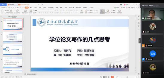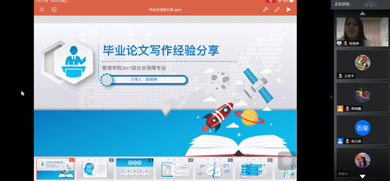 为了帮助学生解决大论文中存在的各种问题,提高毕业论文成绩,5月13日,管理学院通过腾讯会议平台积极开展朋辈教育,举行硕士研究生大论文专场答疑交流会。本次交流会邀请了17级工商管理专业的杨代君同学、17级社会保障专业高鹏飞同学和陈晓琳同学,他们为18级研究生和19级同学们分享了优秀毕业论文是如何“炼”成的,活动反响强烈,吸引了200余名本硕同学共同参加了此次交流座谈会。
