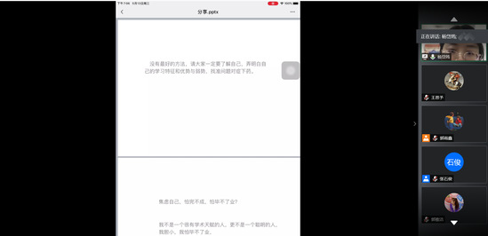 陈晓琳同学分享了论文撰写应注意的事项:第一,摘要非常重要,是论文的浓缩;第二,英文翻译不可完全依赖翻译软件,需斟酌;第三,目录不同标题的字体、间距,要及时更新;第四,技术路线图最好用visio来画图,操作简单,清楚方便;第五,参考文献要中英文结合,引用高水平期刊,规范格式。她的分享解决了同学们在撰写论文中存在的很多细节问题,让同学明白了细节决定成败。