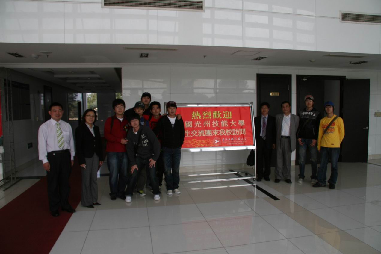 |  10月24日上午,韩国光州技能大学学生交流团一行九人来到我校松江校区进行参观访问,受到了我校的热烈欢迎。 该学生交流团是来我校高等职业技术学院学习CAD技术、参加技能实训以及开展文化交流的,访问时间为10月21日至11月3日。此次是特地来我校松江校区参观的。他们先后参观了我校的行政楼19楼、现代工业实训中心、图文信息中心和艺术楼。我校园林化的校园环境、现代化的教学设施、先进的实训装备和产学合作的教育理念,给韩国学子留下了美好的印象。 国际交流处 | | | 稿件作者:国际交流处 责任编辑:陈文琼