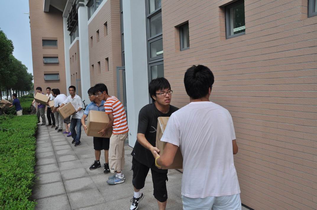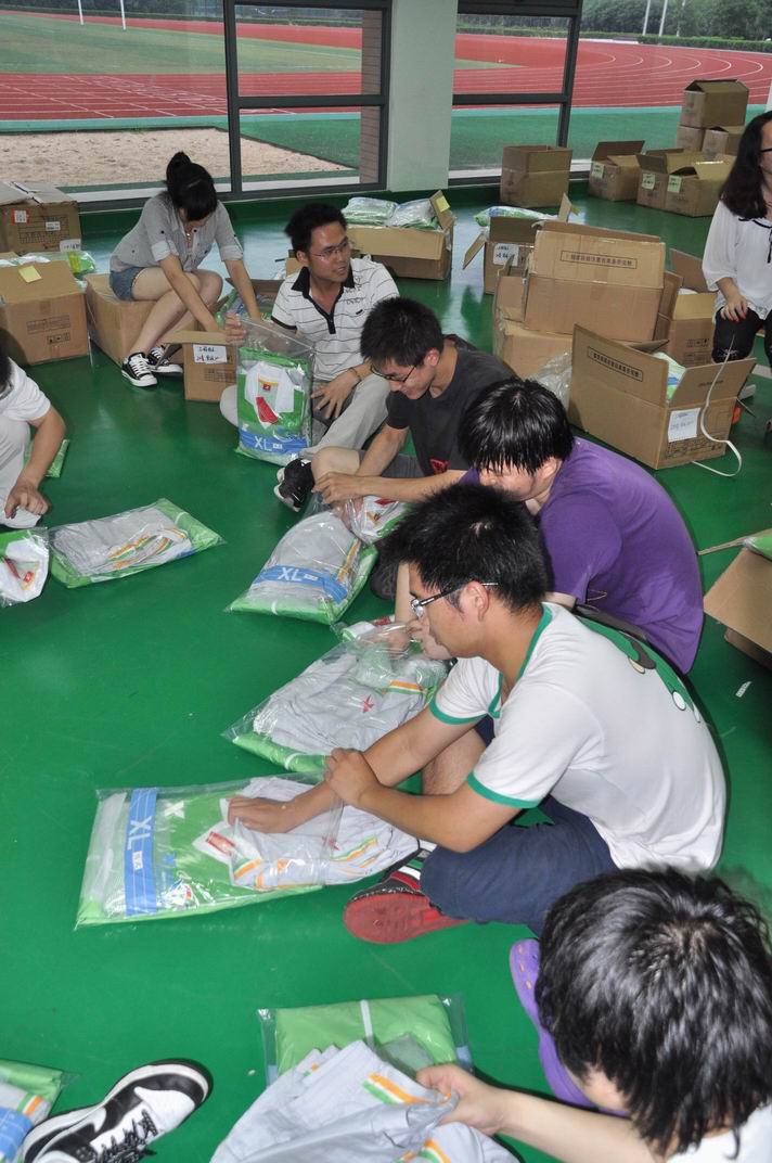 |  7月15日,我校园区内志愿者服装运达我校,我校世博志愿者工作站的全体成员前去体育场看台下的乒乓房接收服装。 下午17:00,服装到达我校,在团委副书记李扬老师的指挥带领下,同学们有条不紊的将一箱箱的志愿者服装从车上搬下,分类运入乒乓房内。由于之前李扬老师已经和同学们交流过意见,并制定出了方案,所以同学们以很快的速度完成了搬运工作。接着同学们开始按照服装的尺寸以及类型将衣服分类堆放。在分类过程中,同学们互相配合,当一个同学报出服装尺寸之后,立刻会有其他同学向他指出服装的堆放位置,同学们在堆放的同时也完成了核对工作。随后工作站的同学们开始了服装的再包装,将一套套服装放入一个个口袋。  最终工作在晚上21:30结束,此时的同学们虽然已经筋疲力尽,但看着完成的工作成果,同学们还是露出了欣慰的笑容。而大家能够在如此短暂的时间内处理掉如此庞大的工作量无疑证明了团结的力量。 |