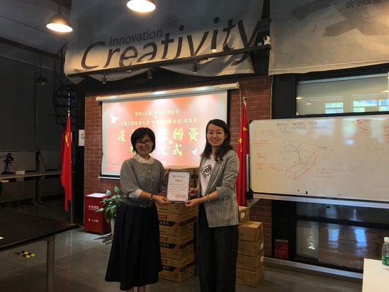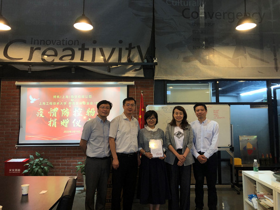 5月19日,博帆(上海)商贸有限公司向上海工程技术大学教育发展基金会及校友会进行了疫情防控物资捐赠,捐赠仪式在仙霞路校区演讲厅举行。出席捐赠仪式的有爱心企业博帆(上海)商贸有限公司董事长ZHANG WENYYAN女士,校方代表有艺术设计学院党委书记袁蓉、中韩多媒体设计学院副书记马建立、副院长顾艺,捐赠仪式由学院副书记马建立老师主持。