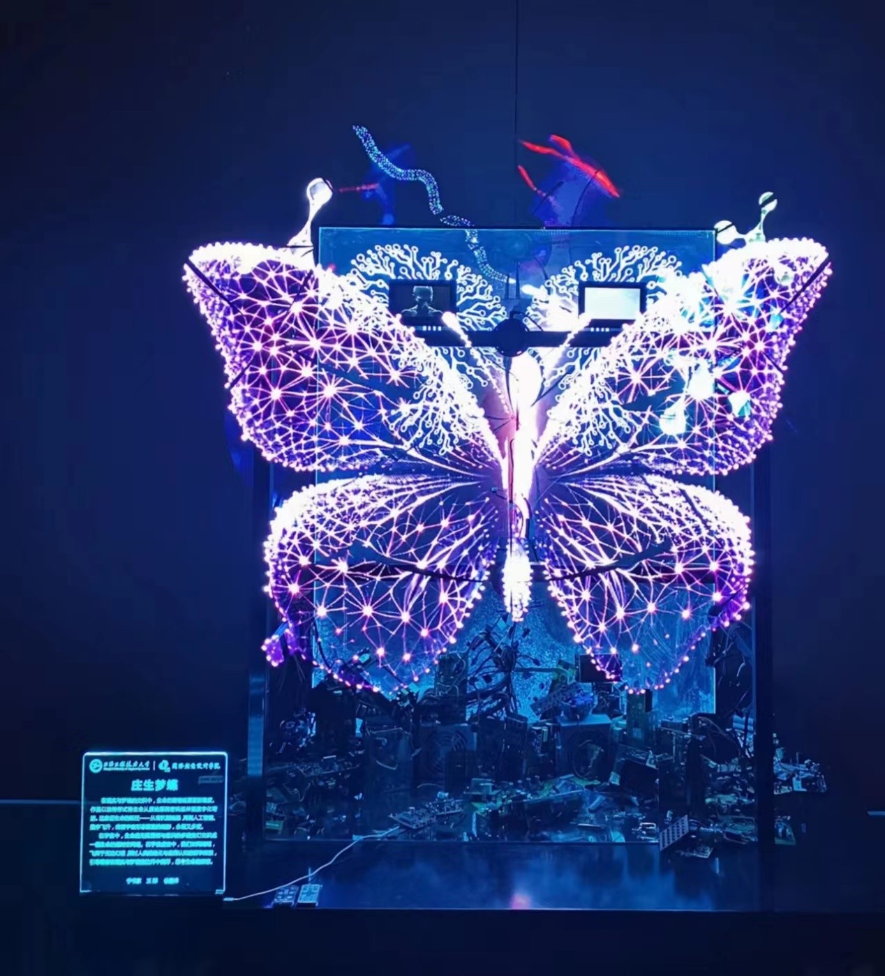 国际创意设计学院宁书家、王郅、徐嘉伟三位老师的实验装置、跨媒介交互作品《庄生梦蝶》,围绕一个众人皆知的中国传统故事,以动态画面展示了生命从原始基因密码延伸至数字化的奇迹,翻飞的蝴蝶象征着生命的飞跃。樊荣老师的作品《生命镜界 同源异构》表达了一切生命平等同源,彼此之间应相互爱护,和谐构建地球生命共同体。其中,《庄生梦蝶》获得白玉兰美术佳作奖。