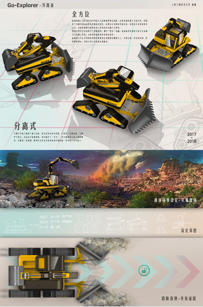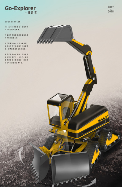 Go-Explorer开路者设计主要创意点有:1. 基于废墟状况,驾驶员工作间可做360度转动和前后移动,主要有前后两个作业区域,实现大范围平面运动,进行大范围搜寻工作,无论是驾驶员视野还是工作所及区域都大大增加; 2、采用分开式左右各两个三角履带轮,便于“把牢”地面,链接轴可使四个轮子完成伸开以及向上支撑,这样使其能够适应复杂的地形; 3、不同于市场上的单个推土设备,前爪采用分离式结构,它带有一定的角度,方便铲斗破土,同时可将铲斗一分为二,将大量的碎石泥土推向两边,开辟出一条道路,既可以合起来完成原来的铲掘功能,还可进行铲斗破土;4、前端的铲斗在不用的时候可以折叠放在后面的挖掘机车上,节省空间,作业的时候,将驾驶室转后,实现大块石头的搬运和粉碎。