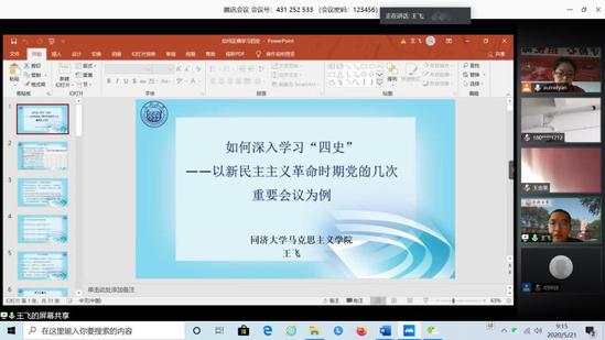 化学化工学院党委特邀中宣部马工程重点项目参与者、中宣部理论通俗读物编写人员、中央马工程教材辅导用书编写人员、全国马克思主义学科发展报告历史虚无主义分编撰写者、同济大学马克思主义学院王飞老师作了题为《如何深入学习“四史”》的专题报告。王老师以新民主主义革命时期党的几次重要会议,包括中共一大和二大、八七会议、遵义会议、六届六中全会和中共七大等为例,讲解了“四史”学习的重点、难点和学习方法,为党员们更有效地学习四史提供了一个新的学习角度和思考路径。同时,王老师在报告中梳理分析了这几次会议对中国共产党发展历程的深刻影响,并对共产党人在革命过程中的革命热情,艰苦奋斗、与时俱进、勇于担当、自我革新的革命精神进行了深入解读,进一步加深了党员们对党的历史和优良传统的理解和铭记。