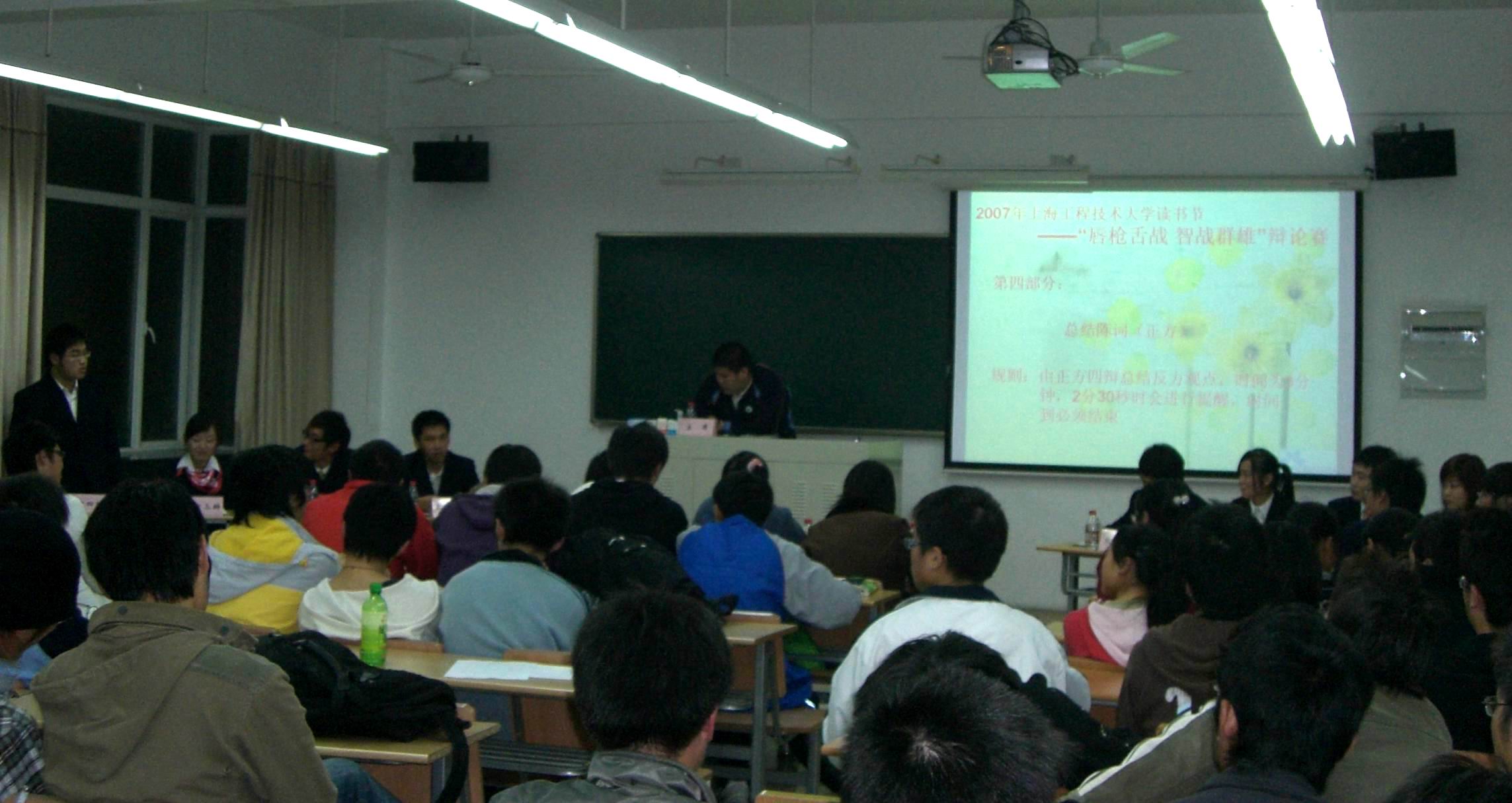 辩论赛决赛的辩题为“读书能够明礼多还是明智多”,双方辩手围绕本场辩题展开了激烈的讨论,发言不时博得台下观众的热烈掌声和赞叹。经过了半个多小时的精彩辩论,汽车工程学院赢得了本次读书节辩论赛的冠军,航空运输学院、材料工程学院分获亚军、季军,汽车工程学院一辩选手邱龙同学获得“最佳辩手”称号。辩论赛结束后,校学生会主席郑晓昱同学向邱龙同学表示祝贺。 本次读书节的最后一项活动——“唇枪舌战,智战群雄”辩论赛已经结束了,然而此次读书节的主题——“多读书,读好书”还将继续在校园、同学间传承下去。