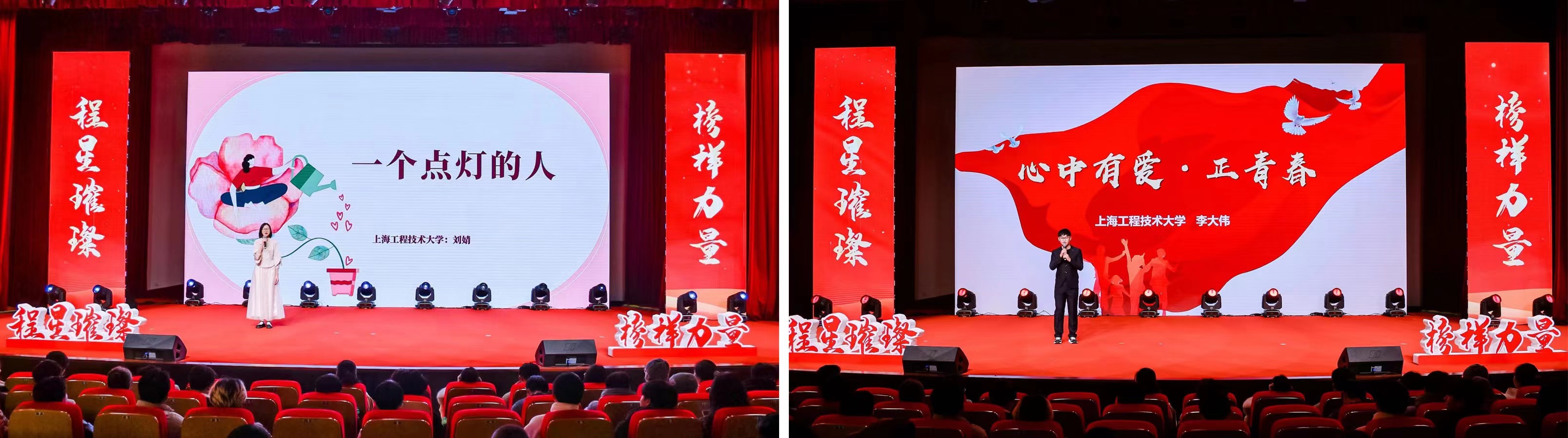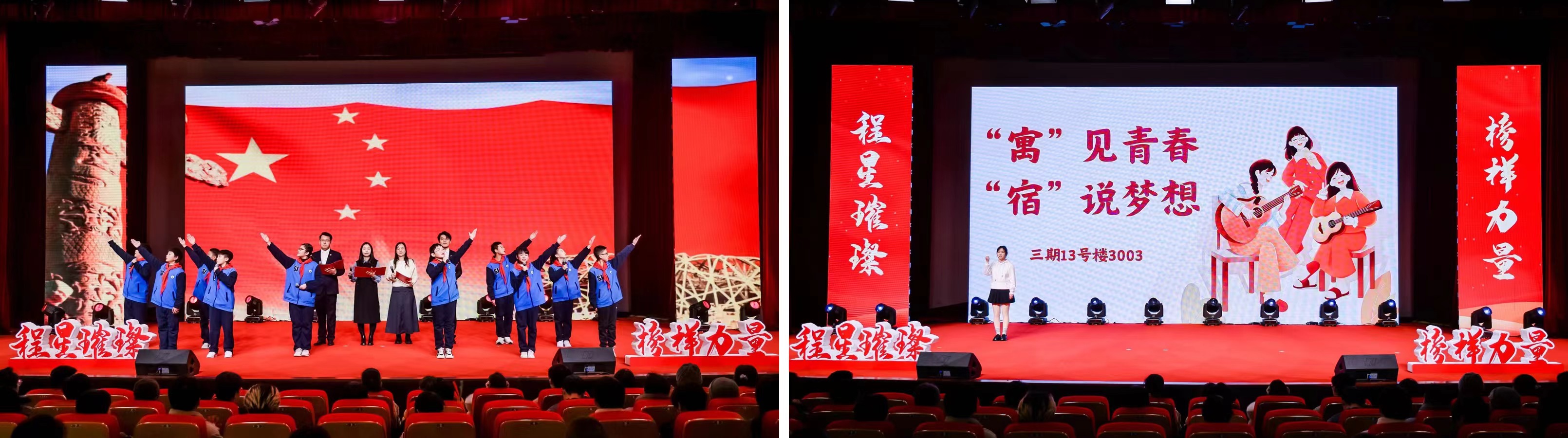 在“星耀程园”篇章,上海工程技术大学附属松江泗泾实验学校学生代表与我校师生代表朗诵《青春之名,强国有我》,表达了师生的拳拳爱国之情及对青春理想的追求;十佳文明和谐寝室的获奖学生代表带来《“寓”见青春,“宿”说梦想》主题演讲,分享了学生日常生活和学习经历,展示了在集体生活中形成的良好风尚习惯和集体合作精神。
