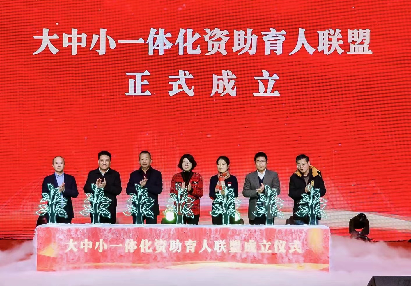 颁奖典礼上,全场师生通过互动扫码形式共同为联盟成立助力加油,随着水滴不断注入,领导嘉宾共同浇灌树苗,生命之树开始变绿,开始生长,“大中小一体化资助育人联盟”正式成立,带来生生不息的希望,象征着同学们在党和国家资助政策的关心关爱下,励志成长,不断奋力前行!该联盟的建立,将通过搭建多层次、多渠道的交流合作平台,充分发挥各学段的优势特长,形成优势资源共享、精准发力的良好局面。