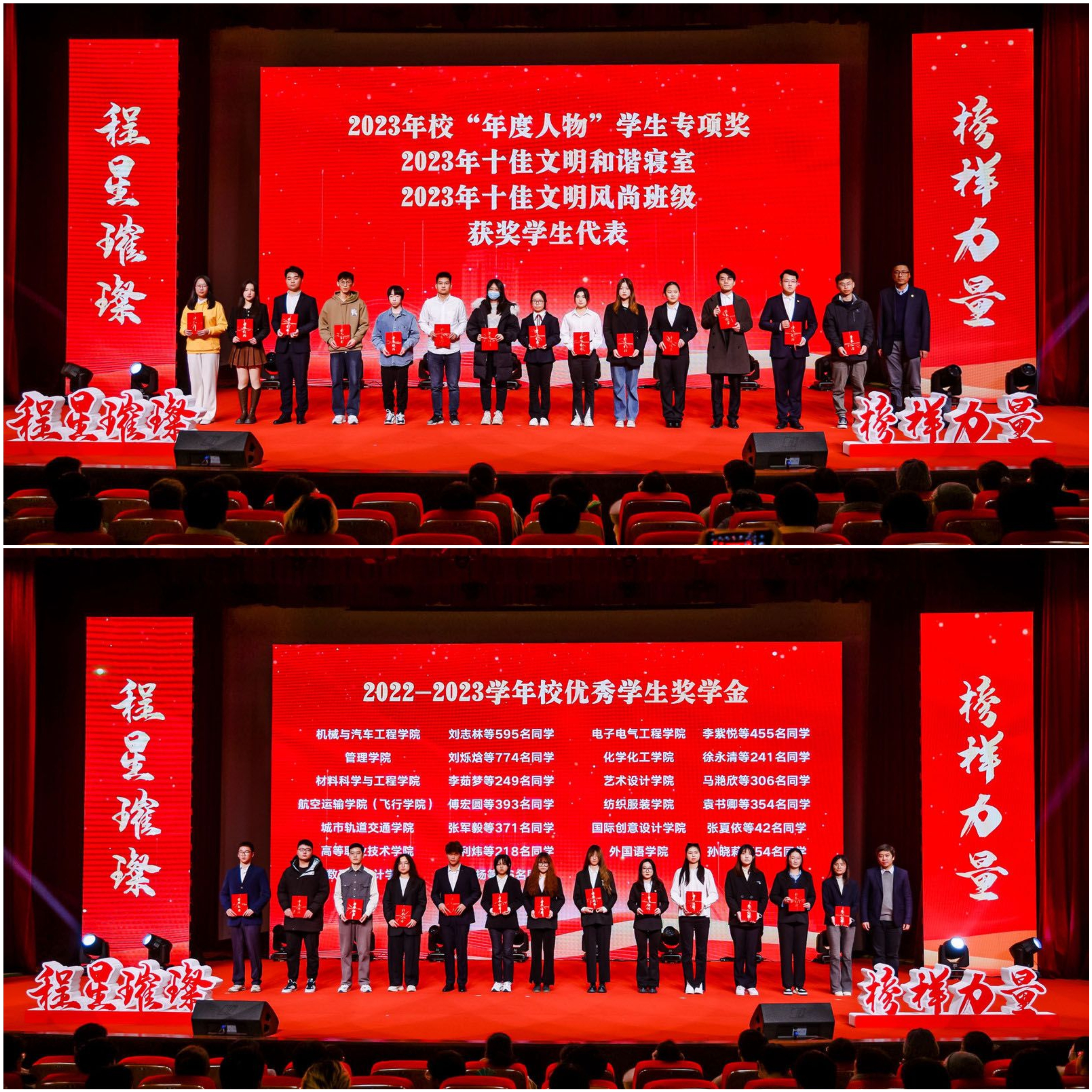 财务处处长王锐,学生工作部(处)长、研究生工作部部长吕宁分别为2023年校“年度人物”学生专项奖、十佳文明和谐寝室、十佳文明风尚班级、2022-2023学年校优秀学生奖学金获奖学生代表颁奖。