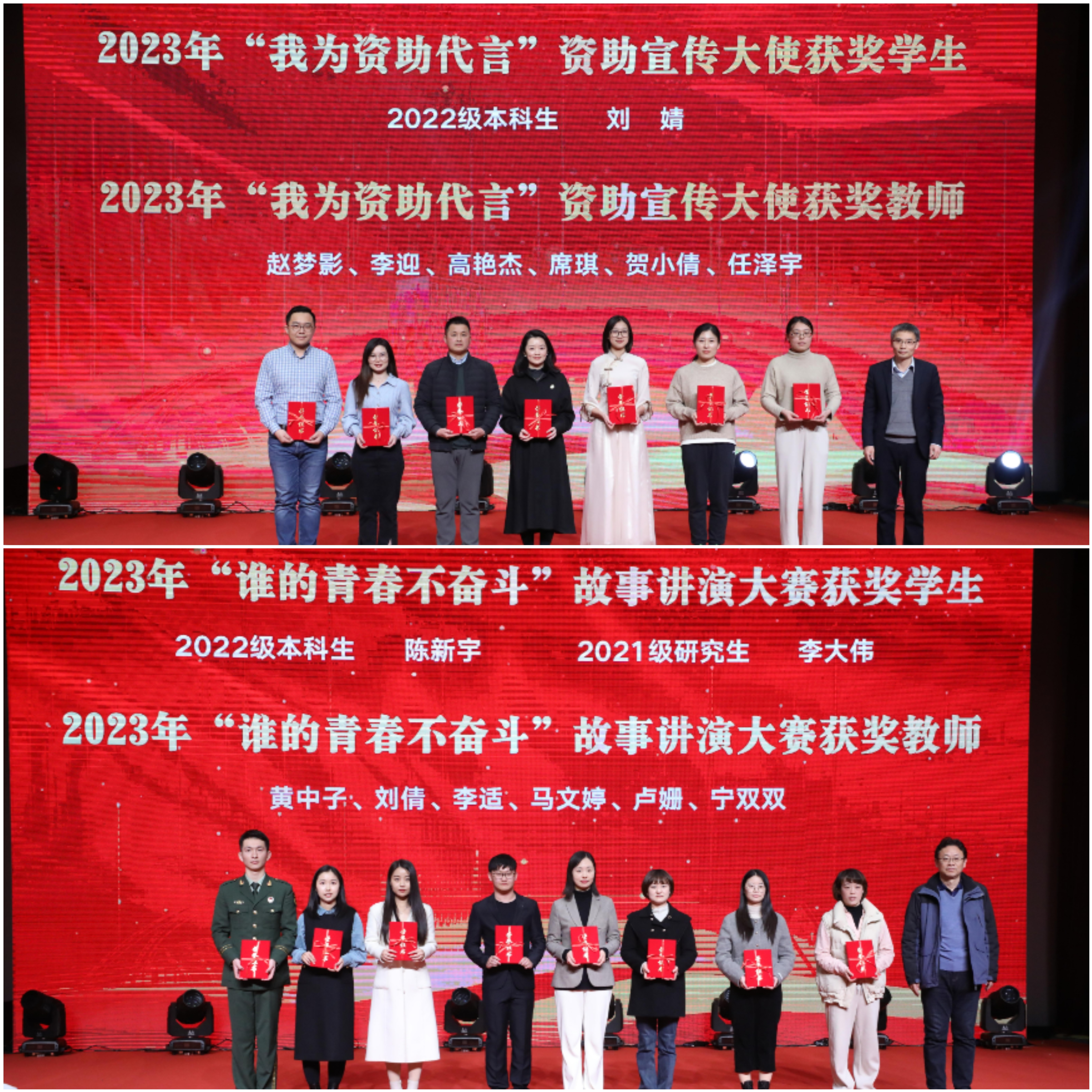 教务处处长饶品华、研究生处副处长何越磊分别为2023年“我为资助代言”资助宣传大使和2023年“谁的青春不奋斗”故事讲演大赛的获奖学生与教师颁奖。