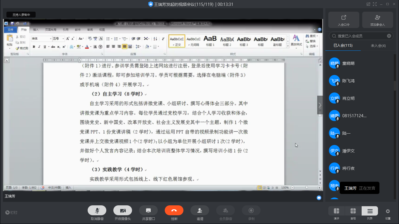 会上,城市轨道交通学院组织员王瑞芳老师进行开班动员及教学方案讲解,王瑞芳老师分别从培训班指导思想、培训目的、培训对象、培训时间、培训方式、培训任务及考核内容进行详细地讲解。本次培训分为线上课程学习24学时,主要是通过大学生网络党校平台以视频学习的方式进行;自主学习8学时,主要包括讲微党课、小组研讨及撰写培训小结三部分,其中讲微党课为重点内容;实践教学4学时,主要采用线上、线下红色展馆参观的形式开展。