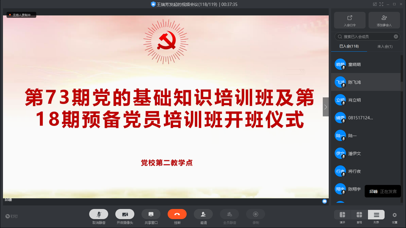 5月27日下午,按照学校党校统一部署,党校第二教学点第73期党的基础知识培训班及第18期预备党员培训班在钉钉线上平台开展了开班仪式,两个培训班共118名学员全部参加开班仪式,会议由航空运输学院组织员邱峰老师主持。