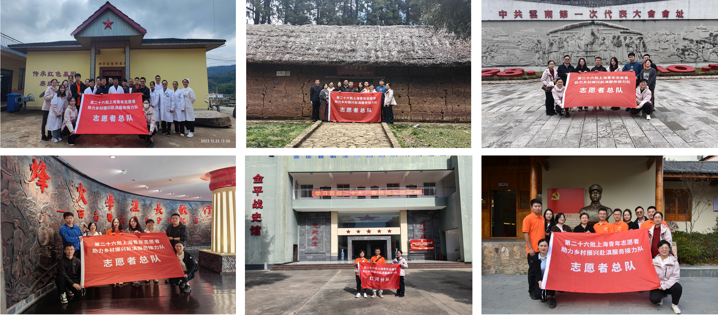 作为纺织服装学院学生第一党支部书记的唐全老师抵达云南之后积极组织全队8名党员向中共共青团上海市委员会直属机关党委申请成立第26批上海青年志愿者助力乡村振兴赴滇服务接力队临时党支部,在收到正式的批复后,组织支部党员开展了多次党建活动,参观学习了中共云南省委第一次代表大会会址、西南联大蒙自分校纪念馆、王建川事迹陈列馆、纳京红色传承馆、金平烈士陵园、金平战史馆等红色教育基地,激励党员队员们秉持初心,牢记党的教诲,牢记使命,用实际行动践行对党的誓言,以青春的热情和活力投身到乡村振兴的伟大事业中,切实发挥党员先锋作用。