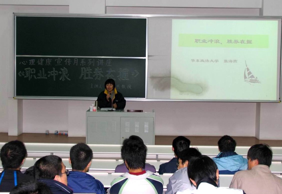 |  为了让本校学生更好更科学地进行职业选择,校心理辅导中心邀请华东政法大学心理健康教育与咨询中心主任张海燕教授,于12月13日晚上18:00在教学楼F420作了一场题为《职业冲浪,胜券在握》的讲座。 张教授首先从社会变迁对择业的影响和缺乏规划造成的不良后果谈起,帮助同学们认识到职业生涯规划的重要性和必要性。接着,张教授为同学们诠释了“职业”的概念,并重点阐述了确定目标、自我定位等方面的内容,帮助大家对自己的未来有更清晰的认识。 张教授谈到,只有认识了自己,知道自己想要什么,对自己有了正确的定位,才能正确地选择一份自己满意的好工作,自己的人生理想、性格气质、道德品质、兴趣特长等在择业上都扮演着很重要的角色。 张教授精彩的讲座让在场的同学感到受益匪浅,激发了大家了解自我,尽早规划自己将来职业发展的热情。讲座结束后,还有不少同学主动向张教授进行咨询和请教。 学生处心理辅导中心 |