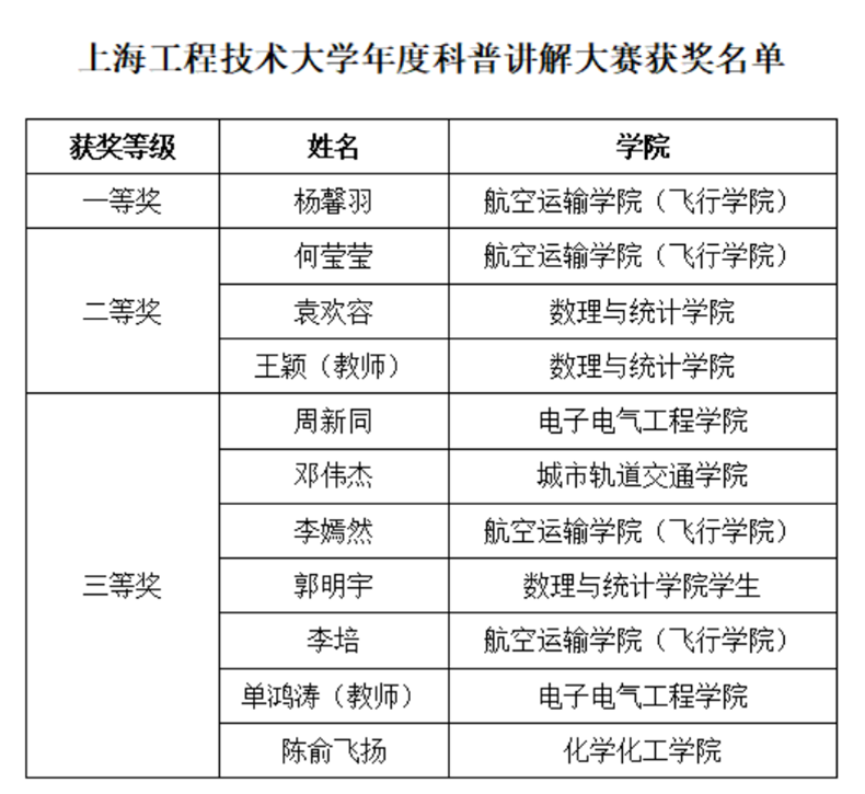 近日,学校2023年度科普讲解大赛落下帷幕。本次大赛以“爱科学、秀科普、讲科普”为目标,围绕“热爱科学,崇尚科学”主题,以科普技能培训和科普讲解比赛相结合的方式进行,成功吸引了来自各学院共30多位师生参赛,最终20名选手晋级决赛。经过激烈角逐,航空运输学院学生杨馨羽荣获一等奖;数理与统计学院教师王颖、学生袁欢容,航空运输学院学生何莹莹荣获二等奖;电子电气工程学院学生周新同等7名选手获得三等奖。
