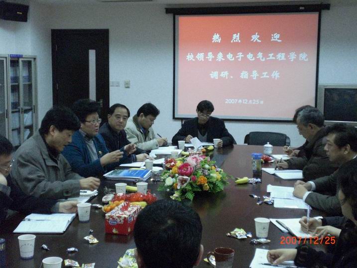 2007年12月25日上午10:00,汪泓校长带领郝建平副校长、校办主任兼国际交流处史健勇处长、规划处张健明处长、科研处胡守忠处长、人事处曹敏年处长、高教研究室叶聚丰主任和教务处刘牧众等领导一行九人前来电子电气工程学院进行调研、指导工作,就学科建设、专业建设、队伍建设、科研工作、校企合作等方面进行指导座谈。电子电气工程学院院长刘启中、党总支书记刘国成及全体院领导班子参加了会议。