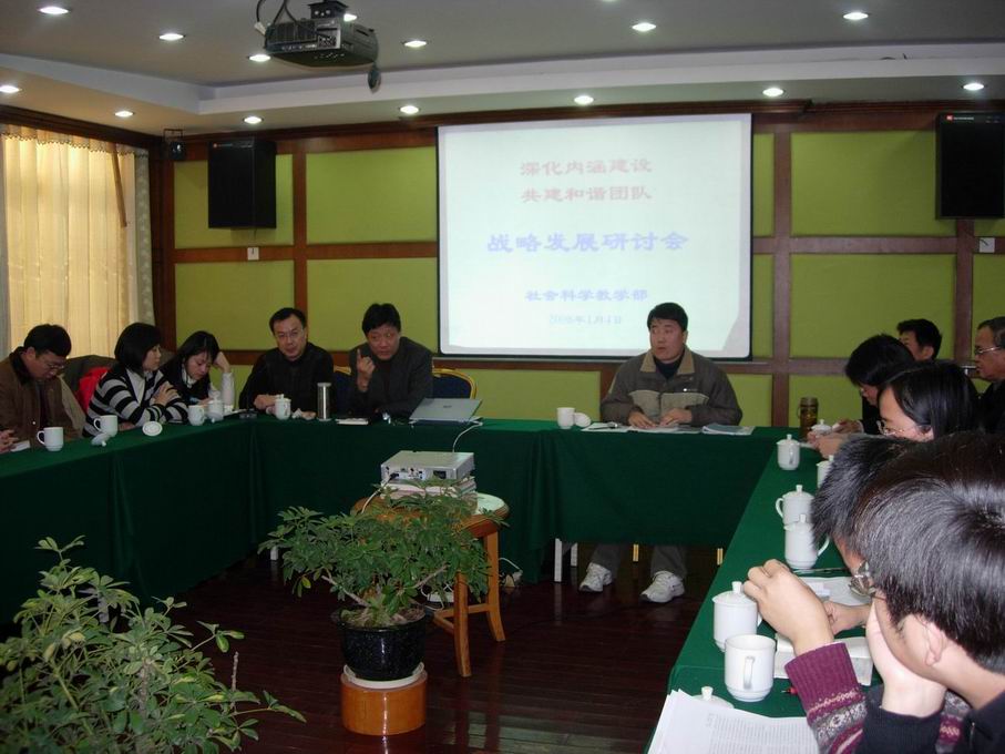 为贯彻“科学发展观”,切实推进“科教兴市”战略及我校建设社会主义现代化特色大学的基本要求,进一步加强学科内涵建设、提升部门科技创新能力与核心竞争力,确保部门科研的可持续发展,2008年1月4日上午,我校社科部全体教职工在沙家浜上汽度假村召开“深化内涵建设,构建和谐团队”战略发展研讨会。该会为社科部第七届教职工民主管理大会的分会,会议由党总支书记吴德清主持。 张健明主任就社科部目前的基本情况出发,提出了“十一五”期间学科发展的指导思想、建设目标和基本思路,以及保障措施。随后,于凯副主任就去年的科研工作做了总结,并进一步对今年的科研任务提出了意见和建议,分别对助教、讲师、副教授、教授的科研任务做了要求,使每位老师都能明确自己今年的科研任务。 会上,教师们认真聆听,对会议内容进行积极思考并踊跃提问发言。会后,教师们纷纷表示,要将压力转化为前进的动力,努力做好工作和科研,力争完成既定目标。 刘珊 稿件作者:刘珊责任编辑:陈文琼