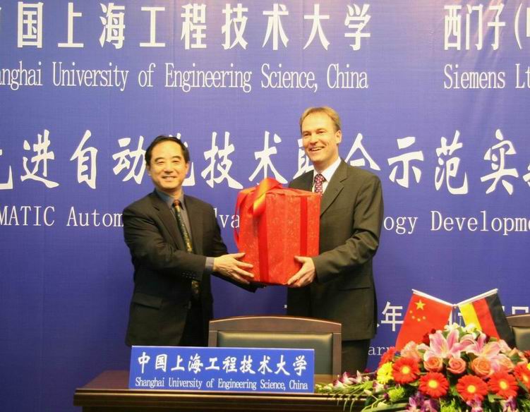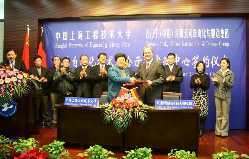 2008 年1月14日上午,我校与西门子(中国)自动化与驱动集团在图文信息中心第三报告厅隆重举行联合示范实验中心签约仪式。校长汪泓、副校长郝建平、校办主任兼国际交流处处长史健勇、宣传部部长余强明、科研处处长胡守忠、学生部(处)长王明复、资保处处长吴海权等校方代表出席了仪式。电子电气工程学院院长刘启中及学院党政领导、部分师生代表参与了签约仪式。西门子(中国)有限公司自动化与驱动集团高级副总裁Klaus Schmid先生,上海西门子工业自动化有限公司总经理姚骏博士,西门子(中国)有限公司自动化与驱动集团自动化事业部市场经理杨大汉先生,上海西门子工业自动化有限公司人事经理陈晓霞女士等7位企业代表出席了仪式。仪式由校办主任兼国际交流处处长史健勇主持。