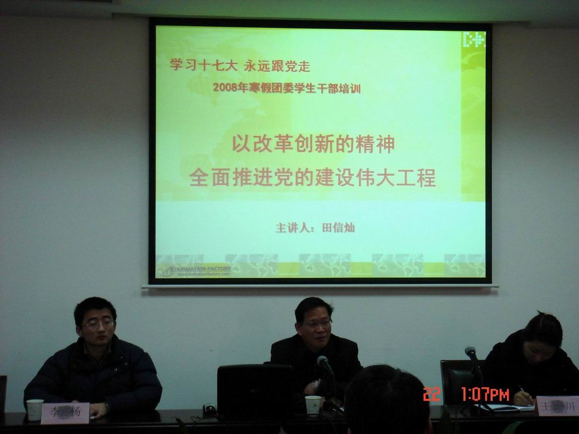 为了更好地总结2007年共青团工作,布置2008年共青团工作,并提高我校共青团干部的理论水平和工作能力,校团委于 校党委副书记田信灿同时指出,全面推进党的建设伟大工程,必须把党的执政能力建设和先进性建设为主线;着力用马克思主义中国化最新成果武装全党;着力建设高素质领导班子;着力增强党的团结统一;着力造就高素质干部队伍和人才队伍;着力加强基层党的建设;着力加强反腐倡廉。 校党委副书记田信灿强调,在深入学习十七大精神的同时,要学以致用,要用十七大精神指导工作。他指出要充分发挥共青团组织的作用,促进学风建设,创建和谐校园;要充分发挥共青团组织的作用,推进党建工作,输送优秀青年;要充分发挥共青团组织的作用,加强维稳工作,维护团员青年权益。同时他强调在团委学生会干部的选拔任用过程中,要公平、公正、公开,要为每一个学生干部创造好的工作环境,给予精心指导,让每一个学生干部发挥最大的潜能。 学习十七大,永远跟党走,我校团委将与时俱进,改革创新,围绕学校中心工作,开展本学期的工作,争取获得更多成绩! 团委 谯明 | |