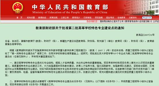 日前,根据《教育部、财政部关于批准2007年度第二批高等学校特色专业建设点的通知》(教高函[2007]31号)的公布获悉,我校艺术设计学院的优势专业 “艺术设计”专业喜获“教育部2007年度第二批高等学校特色专业建设点”项目,项目编号为TS10226,负责人为艺术设计学院院长马新宇教授。艺术设计专业入选如此高规格的教育部建设项目,标志我校“艺术设计”专业已办成特色、优势明显,昂首步入了“国家队”行列,实现了我校教育部特色专业建设零的突破。
