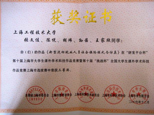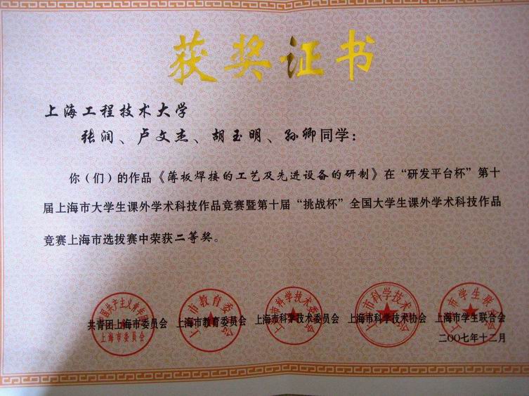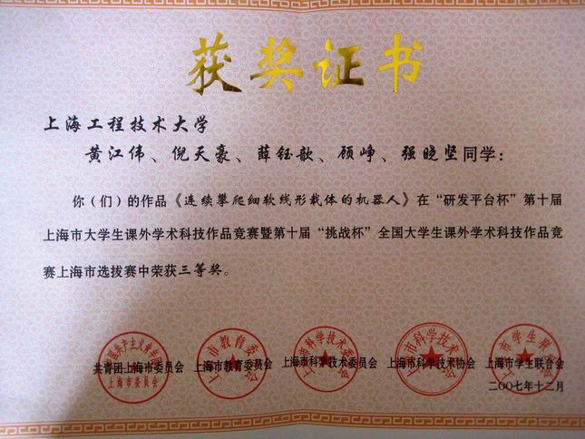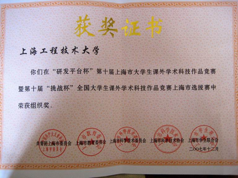 | 我校在“研发平台杯”第十届上海市大学生课外学术科技作品竞赛暨第十届“挑战杯” 全国大学生课外学术科技作品竞赛上海市选拔赛中荣获组织奖,其中,张润、卢文杰、胡玉明、孙卿同学的作品《波板焊接的工艺及先进设备的研制》荣获二等奖,张文佳、陈悦、胡玮、孙茜、王家欣同学的《新型流动就业人员社会保障模式与仿真》作品和黄江伟、倪天豪、薛钰歆、顾峥、张晓坚同学的《连续攀爬细软线性载体的机器人》作品荣获三等奖。 我校化学化工学院轻化工程0413041班、电子电气工程自动化系0212051班、材料工程学院材料科学系0514052班、航空运输学院航空经营管理系0812051班、机械工程及自动化系0111069班、高职学院模具制造与设计1644052班等6个班级被评为2006—2007学年上海市高等学校先进集体荣誉称号;我校张志皓、王煜、
