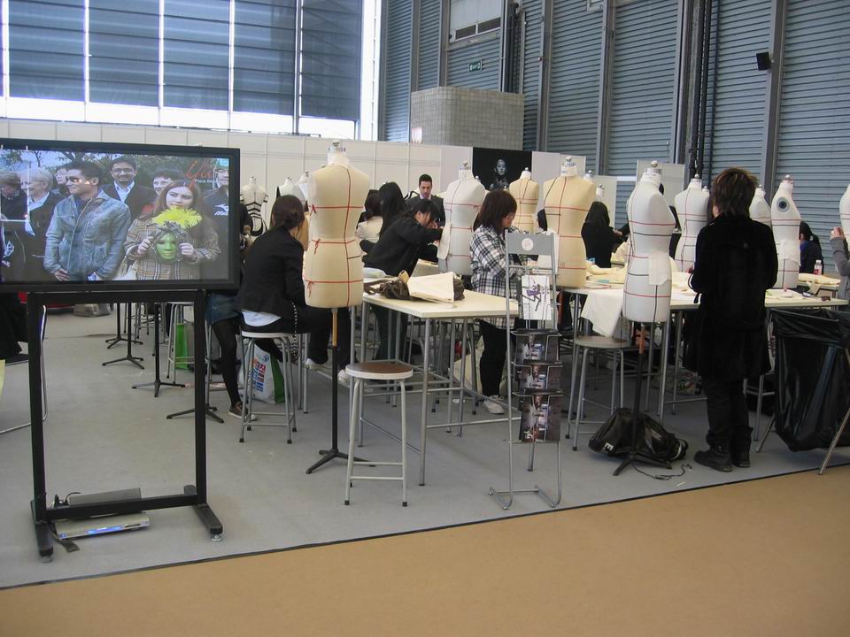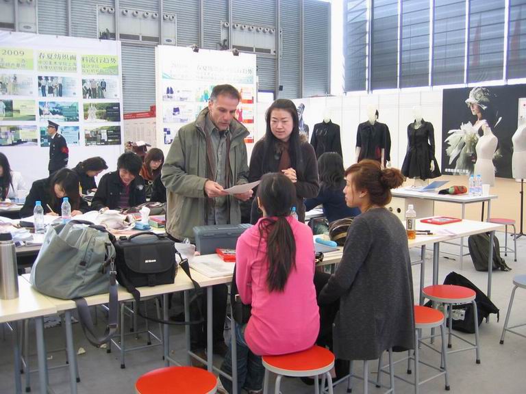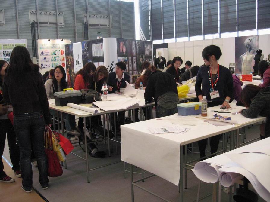 | 中法学院展台采取动静结合展示,以两届毕业秀影像资料与宣传短片的交替滚动播出为背景,静态展示了学生的立体裁剪作品与毕业设计作品。学院还首次引入外教现场授课模式,在展区内专门开辟出两块授课区域,分别展示设计与制作(立体裁剪/平面裁剪)课程的全过程,让与会观众直观感受学院一流的师资力量与国际先进的服装教学理念。 中法学院展台在为期三日的展示期间,吸引了众多业内外人士的驻足观看。观众们饶有兴致的观赏着成衣作品,更对学院的一流服装设计理念与裁制技术产生兴趣,在与外教、工作人员、学生等的交流过程中,对我院中外合作教学取得的成果表示了极大的认可。