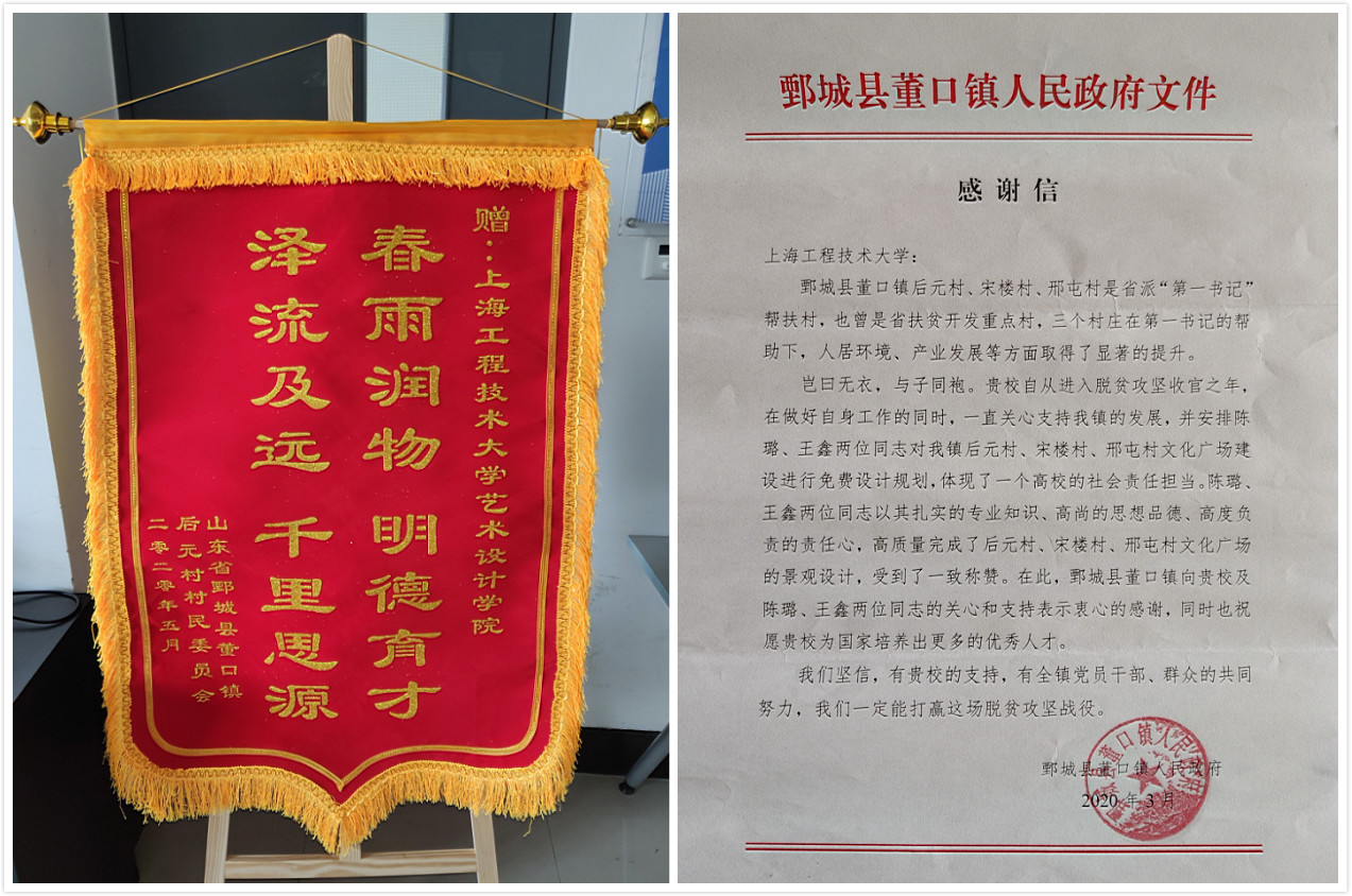 近日,艺术设计学院收到了来自山东省菏泽市鄄城县董口镇政府的感谢信和锦旗,村民们用质朴的语言感谢副院长任钟鸣、产学研办公室常务副主任陈璐为所辖后元村的村文化广场进行规划设计,“水缸蓄水”的设计方案不但反映了“幸福生活是努力奋斗”的这一主题,同时彰显了2020年红色乡村脱贫攻坚的决心和意志。