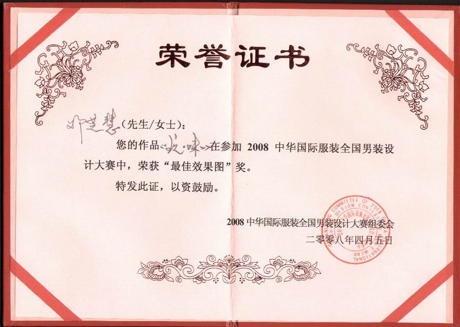 大赛邀请了上海市服装行业著名企业家、上海服装行业协会秘书长戴自毅,中国服装功勋人物奖章获得者、高级服装设计师李欣,中国企业报协会纺织服装分会会长、中国纺织报社社长兼党委书记迟 邓芝慧同学的“玩味”系列,充分发挥想象力与创造力,以经典红白黑色彩搭配,装点出极具时代感的男性形象;配合个性的背景烘托与清晰地工艺说明,使整款系列具有很强的完整性与可实现性,获得了评委会成员的一致青睐,最终获得“最佳效果图”奖。这一奖项不仅是对于学生个人的肯定,也是对于学院长期以来教学成果的肯定。