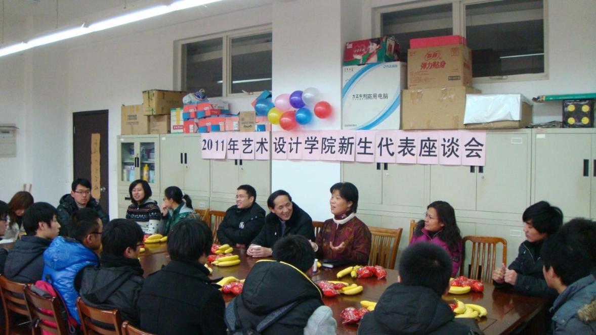 |  1月5日 中午12:00,浓浓情意在C111办公室弥久不散,2011年艺术设计学院新生代表座谈会在这里召开。院党总支书记潘惠德老师,及全体辅导员老师出席了会议,全院外地生和困难生的部分新生代表参加了会议。会议由总支副书记何志琴老师主持。 会议伊始,何老师首先介绍了学院外地生和困难生的基本情况,通报了学院2010年的学生帮困工作,询问了外地生和困难生的学习和生活等情况,并与同学们亲切交流谈心。会上,同学们纷纷畅所欲言,结合自身家庭情况和成长经历,畅谈了受助的切身的感触和对学校关怀之情的谢意:同学们多次提及,正是学校与学院的多项贫困生资助项目使得他们的学习和生活有了保障,减小了家庭经济困难给他们带来的不利影响;新生们表示学院辅导员老师对他们的关心、支持和帮助让身处异乡的他们同样感受到了家的氛围与温暖。 会上,党总支书记潘老师发表了热情洋溢的讲话。他指出,同学们从五湖四海来到一个大家庭就是一家人,都要互帮互助。困难是暂时的并不可怕,困难是可以克服;他还为同学们讲解了专业学习、大学规划、职业规划,鼓励大家珍惜在校的时间,努力学习,跃马扬鞭奔向美好明天。 最后,潘老师、何老师为在座的同学们分发了慰问品。